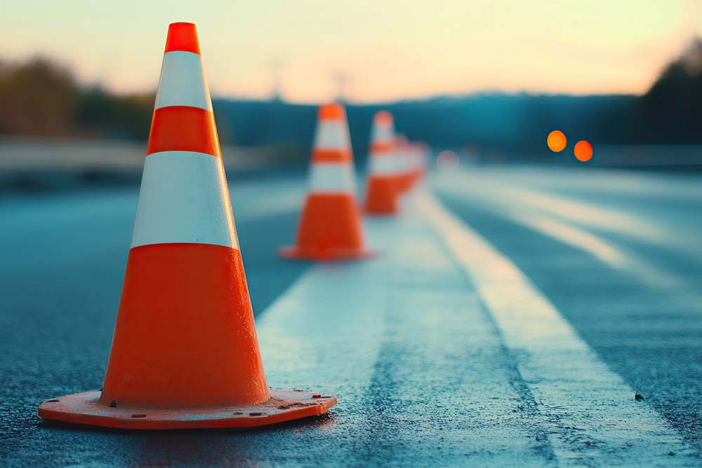 séparateurs modulaires de voies, passerelles de tranchée, cônes et délinéateurs de chantier.